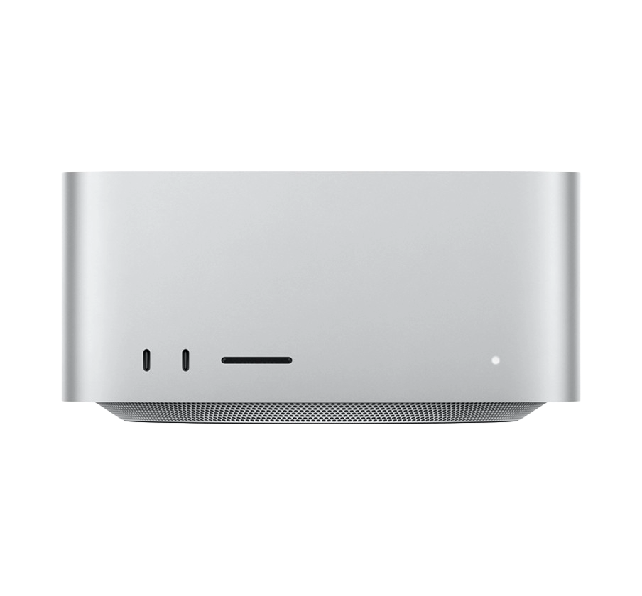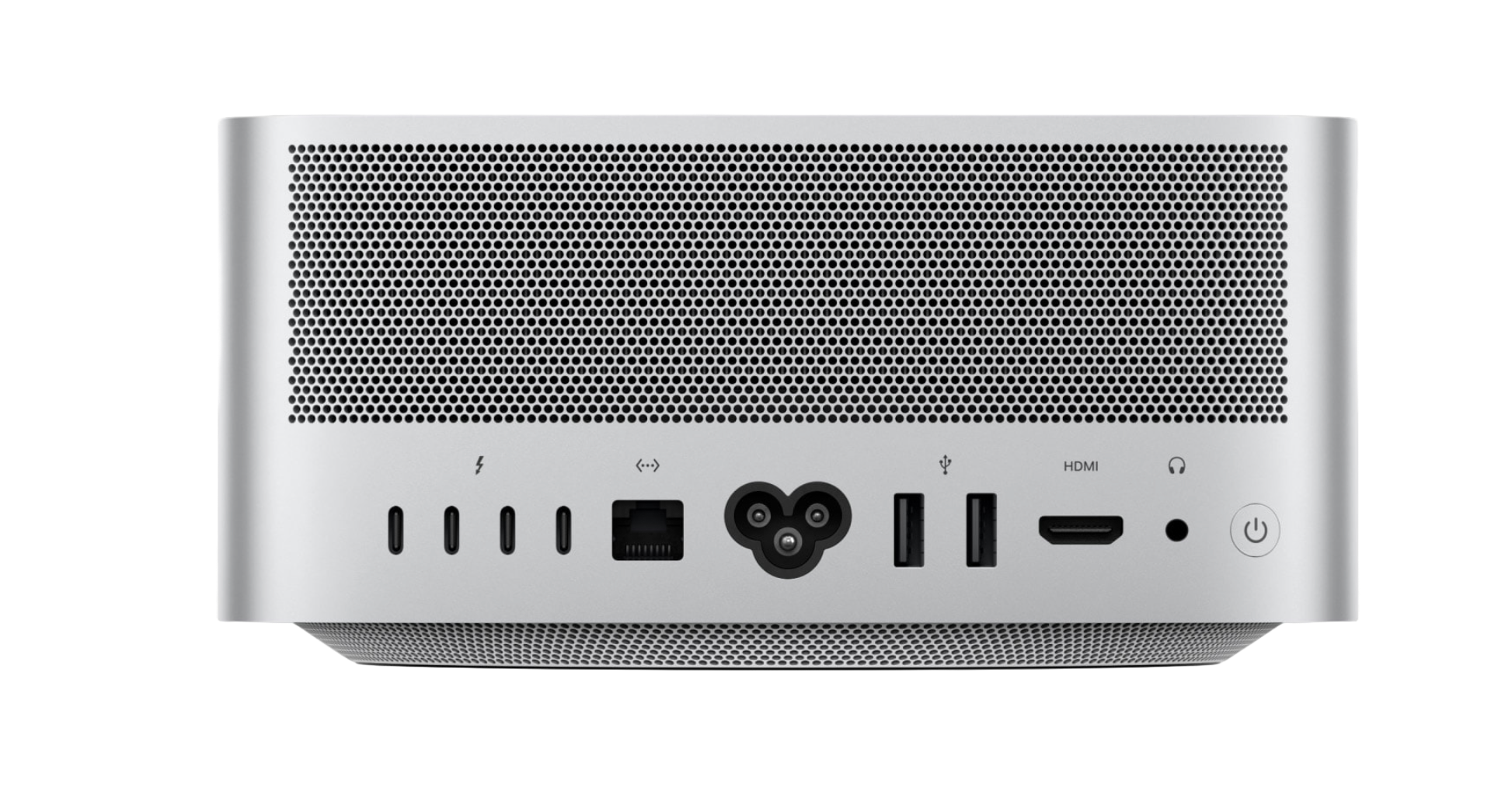 Back: Four Thunderbolt 4 ports, two USB-A ports, one HDMI port, one 10Gb Ethernet port, one 3.5 mm headphone jack